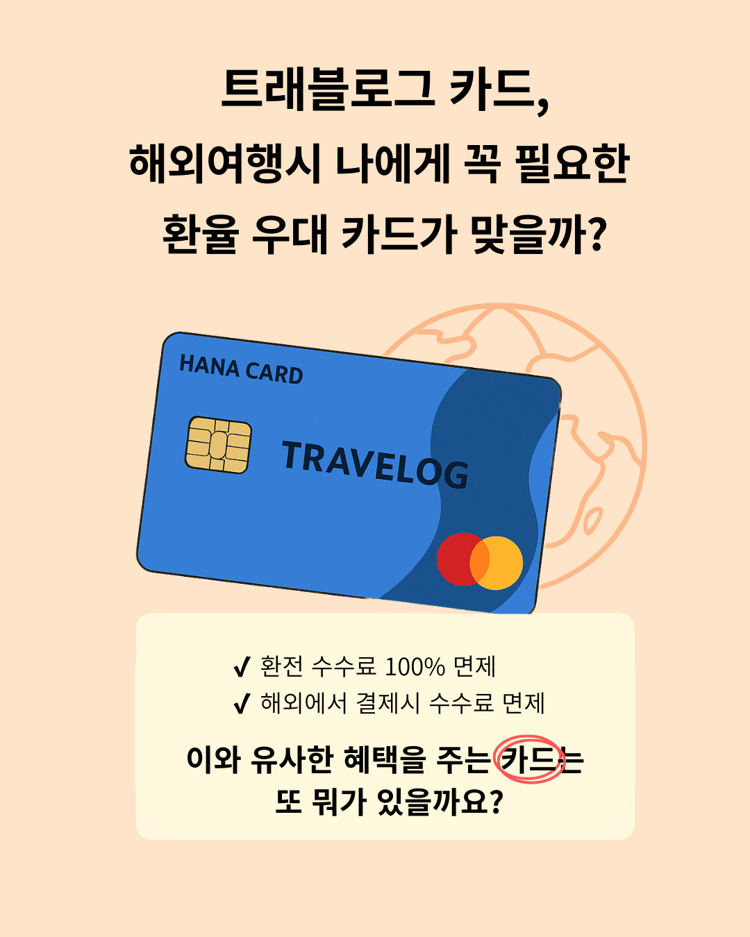 해외여행을 준비할 때, 항공권과 숙소 예약만큼 중요한 것이 바로 환전과 카드 선택입니다. 최근 많은 여행자들이 선택하는 하나카드의 트래블로그 카드는 환전 수수료 절약과 다양한 혜택으로 주목받고 있는데요. 이번 글에서는 트래블로그 카드의 장점과 함께, 그에 버금가는 환율 우대 카드들을 비교해 볼게요.